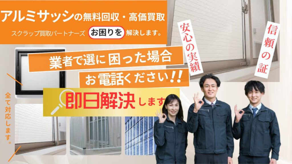 アルミサッシの買取価格は、当日のアルミ相場、サッシ本体の重量、そしてガラス、網戸、ビス、ゴム、プラスチック部品などの不純物(ダスト)の付着量によって変動します。当社では、お客様のアルミサッシを丁寧に査定し、適正な価格をご提示することをお約束します。