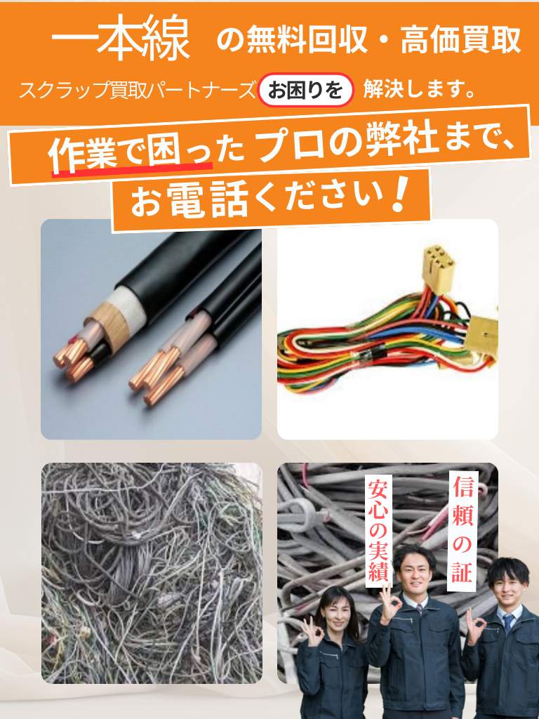 以下のような一本線・電線スクラップを高価買取しています。ご不明な点はお気軽にお問い合わせください。