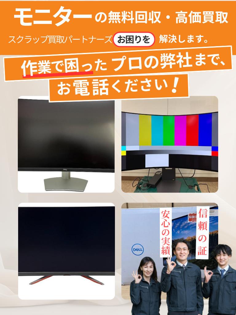 一般的なPCモニター、4Kモニター、湾曲モニターなど、サイズやメーカーを問わず回収します。電源が入らない、画面が割れている状態でもOKです。
